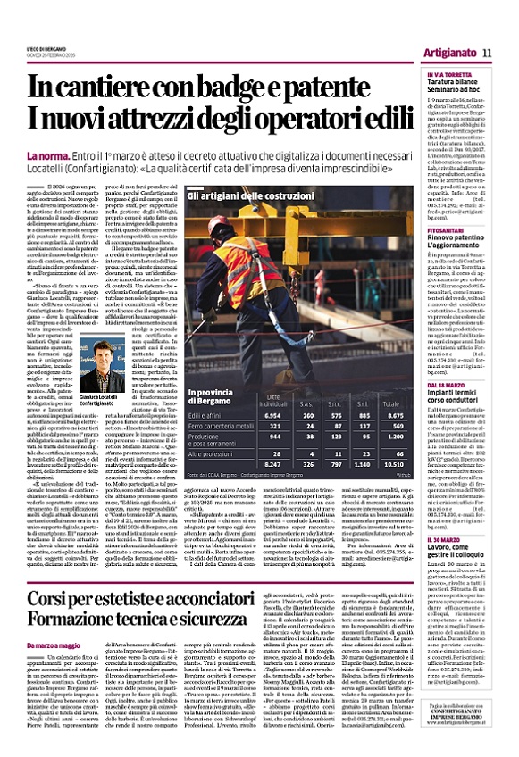 L’Area Costruzioni di Confartigianato Imprese Bergamo è al centro sulla pagina de L’Eco di Bergamo di giovedì 26 febbraio dedicata all’artigianato.