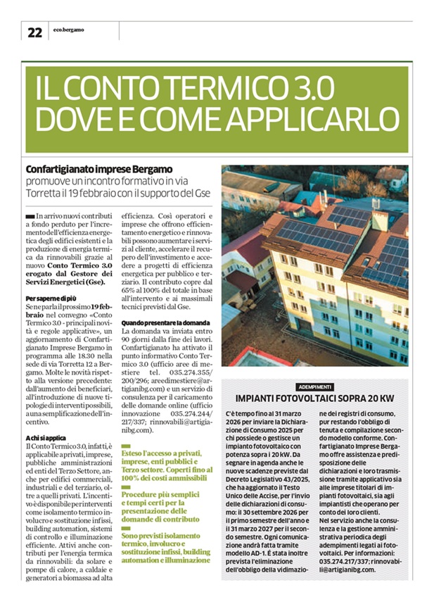 Conto Termico 3.0: dove e come applicarlo, su ECO.BERGAMO di febbraio