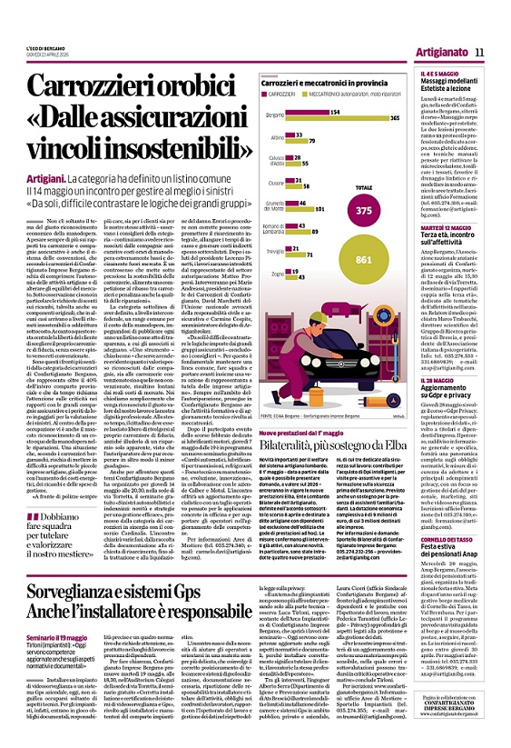 Carrozzerie, seminario videosorveglianza e prestazioni ELBA su L’Eco di Bergamo del 23 aprile