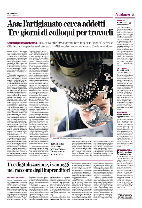 Sulla pagina de L’Eco di Bergamo di giovedì 26 marzo dedicata all’artigianato si parla dei Job Days, la nuova iniziativa promossa da Confartigianato Imprese Bergamo per favorire l’incontro tra domanda e offerta di lavoro.